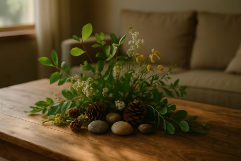 - Nature et authenticité : Utilisez des branchages, pommes de pin, feuillage hivernal (houx, eucalyptus), fagots de cannelle, pour une ambiance nordique et simple.