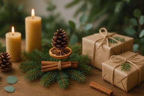 - Nature et authenticité : Utilisez des branchages, pommes de pin, feuillage hivernal (houx, eucalyptus), fagots de cannelle, pour une ambiance nordique et simple.